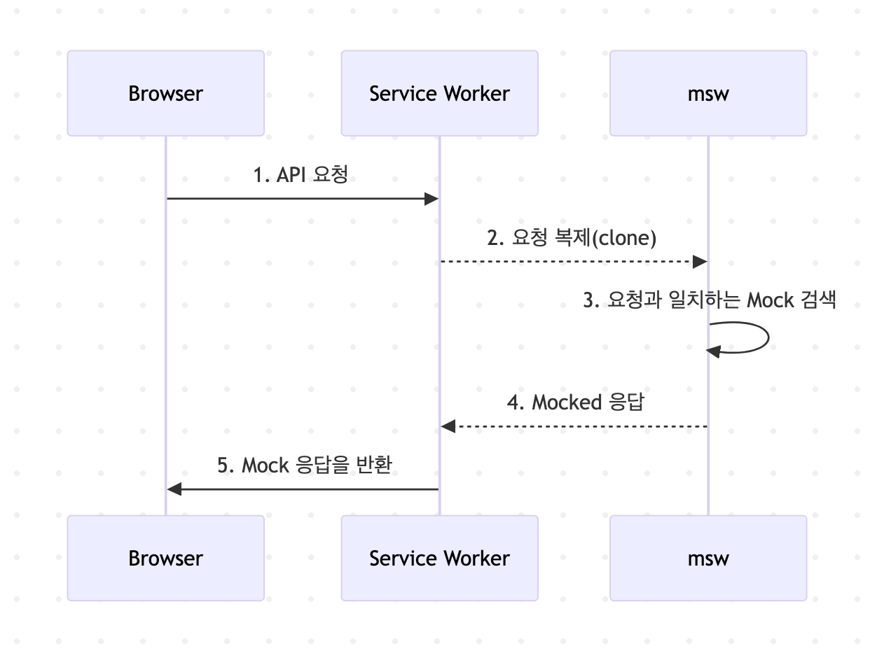일치하는 핸들러를 찾으면, MSW는 실제 네트워크 통신 없이 Mock 데이터를 생성하여 브라우저에 "마치 실제 서버에서 온 것처럼" 응답한다. 일치하는 핸들러가 없으면 요청을 그대로 실제 서버로 전달할 수도 있다.