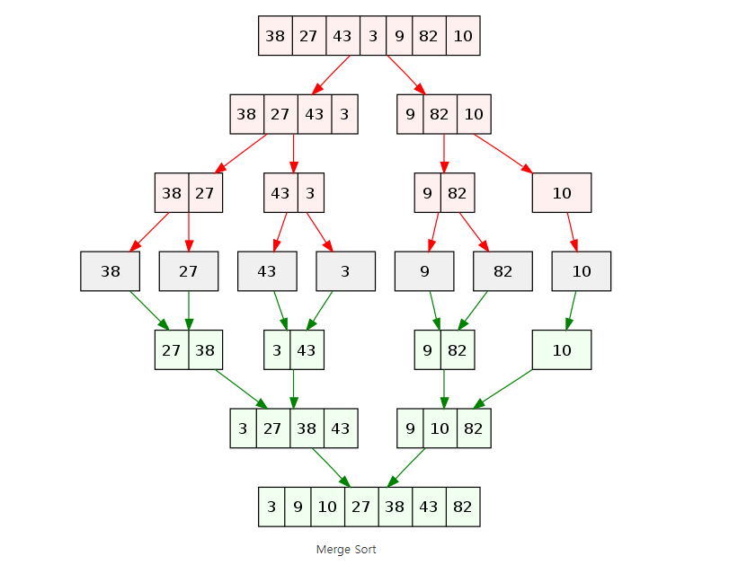 - 전체 원소를 하나의 단위로 분할한 후 분할한 원소들을 다시 병합하는 정렬